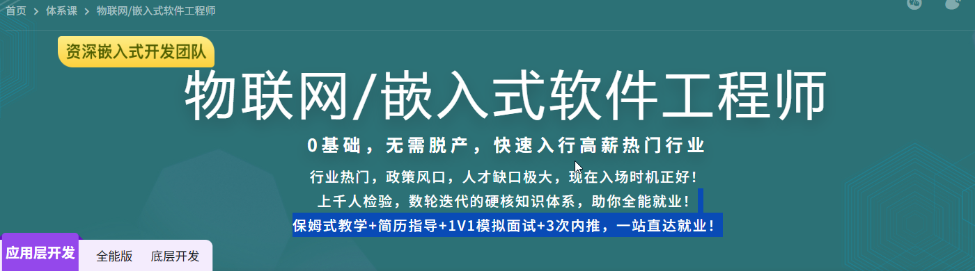 嵌入式开发的主流操作系统是Linux操作系统,这一阶段由一线12年经验的高级工程师进行授课,主要让学员掌握Linux 下多线程、多进程编程思想和常用的IO模型,让自己开发的软件能充分发挥多核CPU优势,提升软件性能。