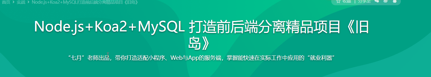 本课程从0到1开发一个前后端分离的精品项目《旧岛》,手把手教你用Node.js KOA2打造超好用的 Web框架,从而带前端同学彻底攻克服务端开发难点和头疼的Mysql数据库知识,对于同学们开发前端有极大的帮助,是同学们就业升职的利器。