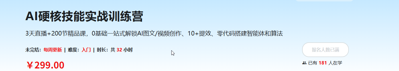 不论你什么行业/岗位、会不会代码,AI都能让你效率×10、职场加速。本课通过3天直播+200节精品课,带你从0基础一站式将AI硬技能收入囊中(AIGC、大模型、Agent、Python、算法),通过抖音爆款短视频、小红书文案、智能客服、口语助手等实战案例,带你从AI创作、提效到零代码搭建AI应用,进阶学习智能体开发技能和算法,让你更了解AI底层机制,充分发挥AI效能,助力你快速把AI变成生产力!抢先锁定AI红利快车道!