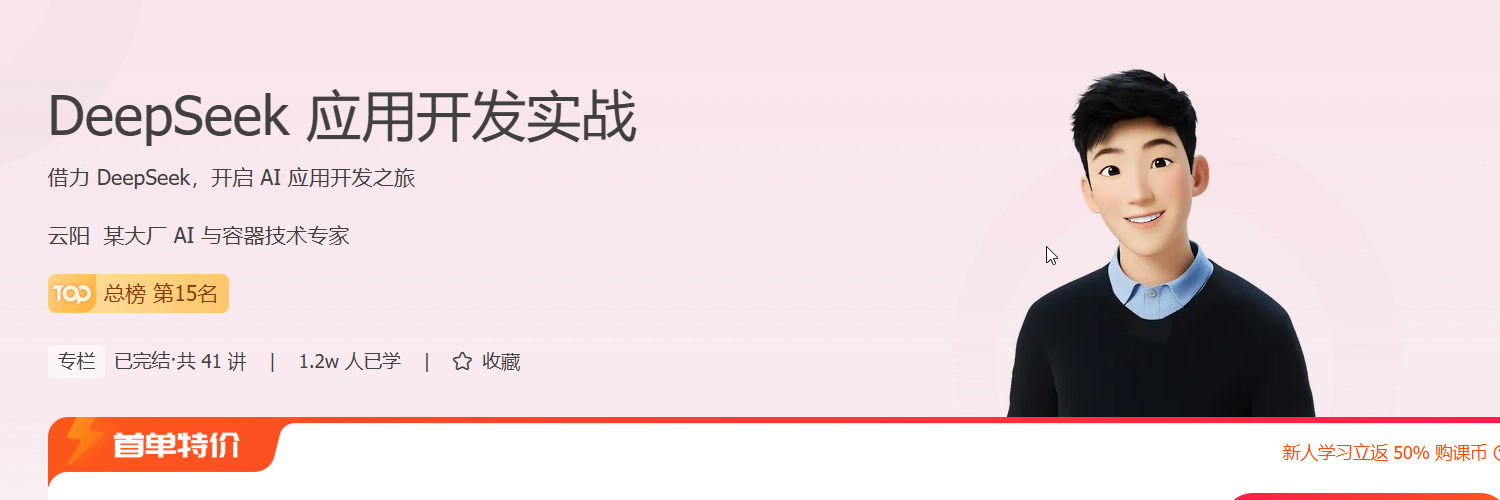 无论是否是计算机或 AI 专业出身,每个人都有机会在 AIGC 浪潮中找到自己的位置。为了帮助你与时俱进,快速拥抱 DeepSeek 等前沿技术,我们邀请了云阳老师开设这门课程,带你学习如何基于 DeepSeek,综合提升自己的 AI 应用开发工程化能力。