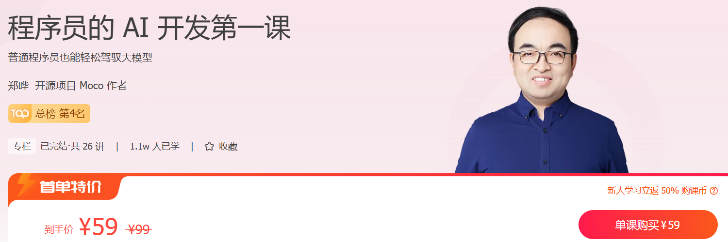 如果你也有同样的困惑,那么《程序员的 AI 开发第一课》正是为你量身准备的。这门课里,我们邀请了拥有二十多年开发经验的郑晔老师,带你从普通开发的视角快速熟悉大模型,开启 AI 应用开发之旅。