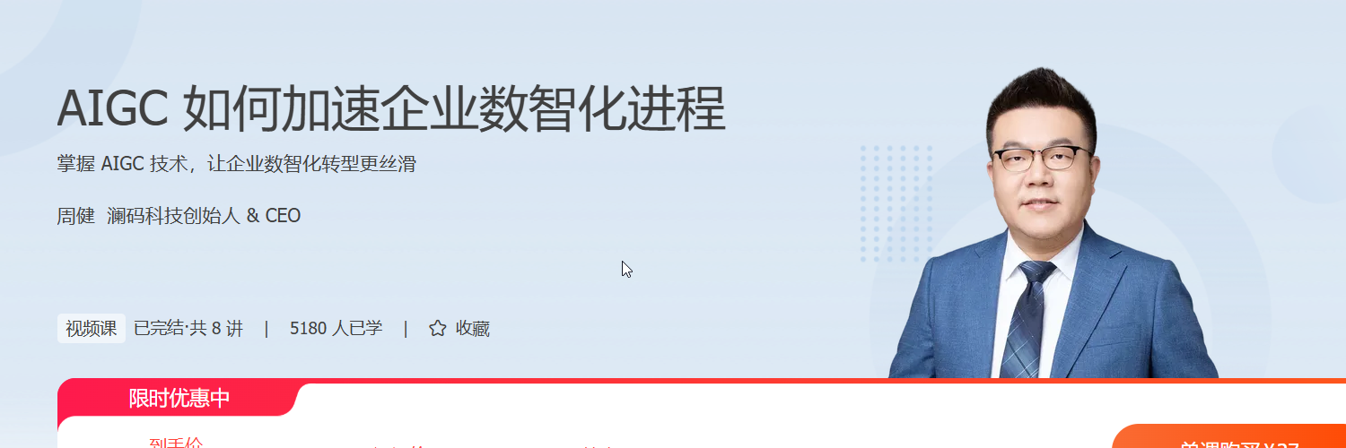 为此,我们特此推出了《AIGC 如何加速企业数智化进程》系列课程。该课程是一门针对希望利用生成式 AI 技术推动企业数智化转型的学员设计的课程。