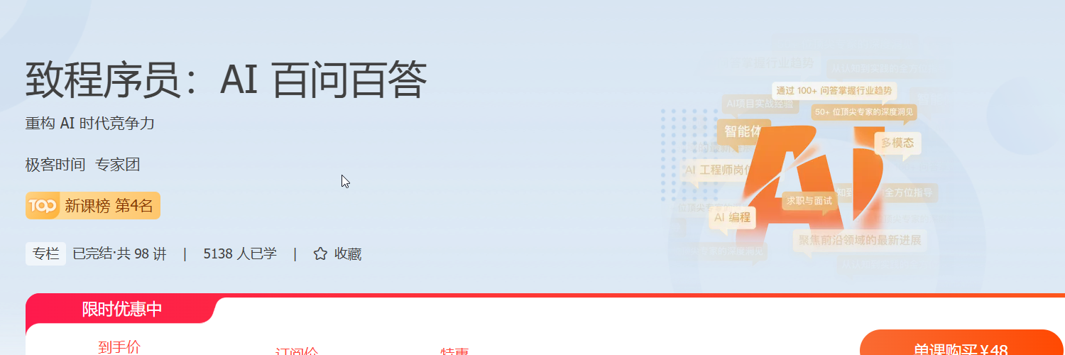 AI 这个日新日异的领域,可能根本不存在完美解法。这门课更像是一本“求生手册”,记录了极客时间专家团队在 AI 浪潮中的真实探索:有人踩坑,有人破局,有人还在摸索。希望这些经验能帮你缓解一点焦虑,至少让你知道:“哦,原来还可以这么干! ”
