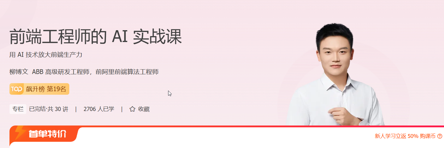 为此,我们邀请了长期深耕在 AI + 前端领域的柳博文老师,推出这门前端工程师的 AI 实战课,让你用最高效的方式建立对 AI 技术的清晰认识,给你带来技术和经验的双重收获。