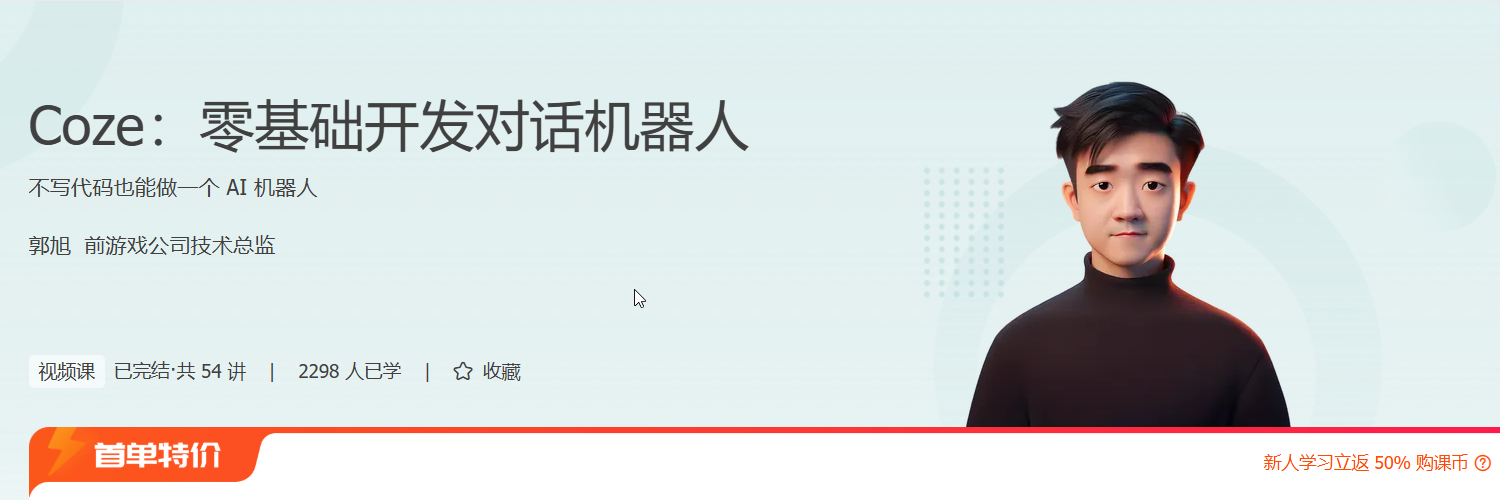 你是否想过,无需编程基础也能打造专属 AI 对话机器人?本课程《Coze:零基础开发对话机器人》正是为此而生!课程由前游戏公司技术总监郭旭主讲,依托字节跳动推出的 Coze 平台,带你从零掌握对话机器人开发全流程。无论你是职场人、企业主还是学生,都能通过本课快速构建智能客服、信息查询、内容生成等实用 AI 工具。