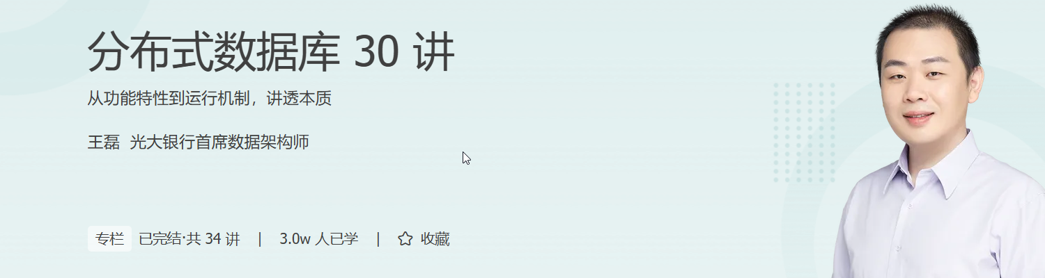 在数据爆炸的时代,分布式数据库已成为支撑海量数据处理的核心引擎。《分布式数据库 30 讲》由光大银行首席数据架构师王磊主讲,系统拆解分布式数据库的五大核心模块:架构设计、事务机制、查询优化、数据复制与容灾部署。课程以 TiDB、CockroachDB 等主流系统为案例,深入剖析 NewSQL 与 PGXC 架构差异,解析 Raft 协议、MVCC、SSI、向量化执行引擎等关键技术,带你从原理到实战全面掌握。