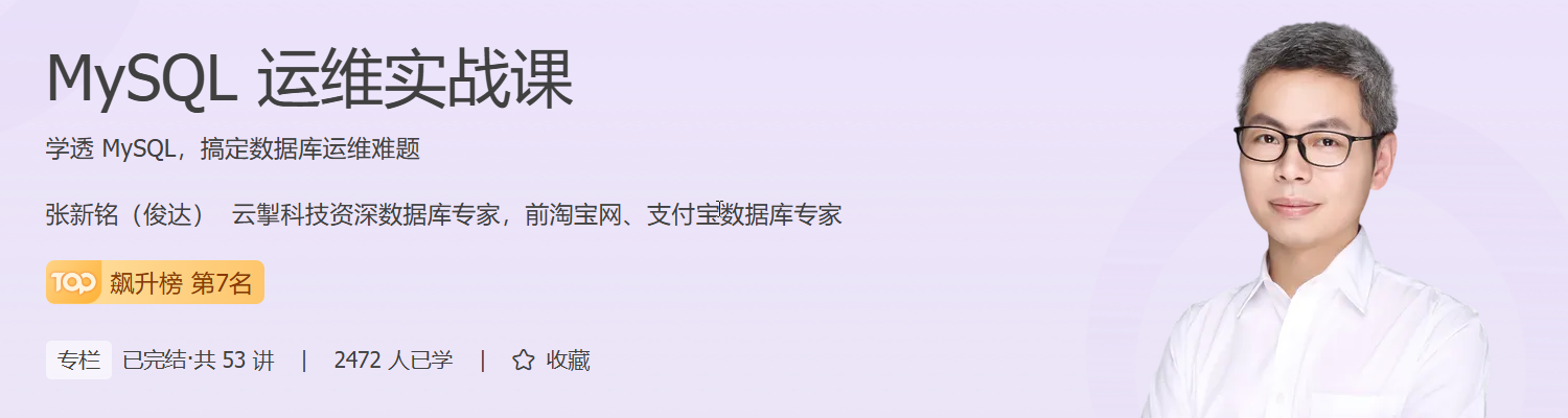 在后端系统中,数据库是支撑业务稳定运行的核心组件,而 MySQL 作为最流行的开源关系型数据库,其运维与架构能力已成为后端工程师和架构师的必备技能。本课程《MySQL 运维实战课》由资深数据库专家张新铭主讲,聚焦 MySQL 8.0 的核心运维技能,从安装部署、SQL 优化、InnoDB 引擎原理到高可用架构设计,层层递进,覆盖数据库运维的全链路知识体系。
