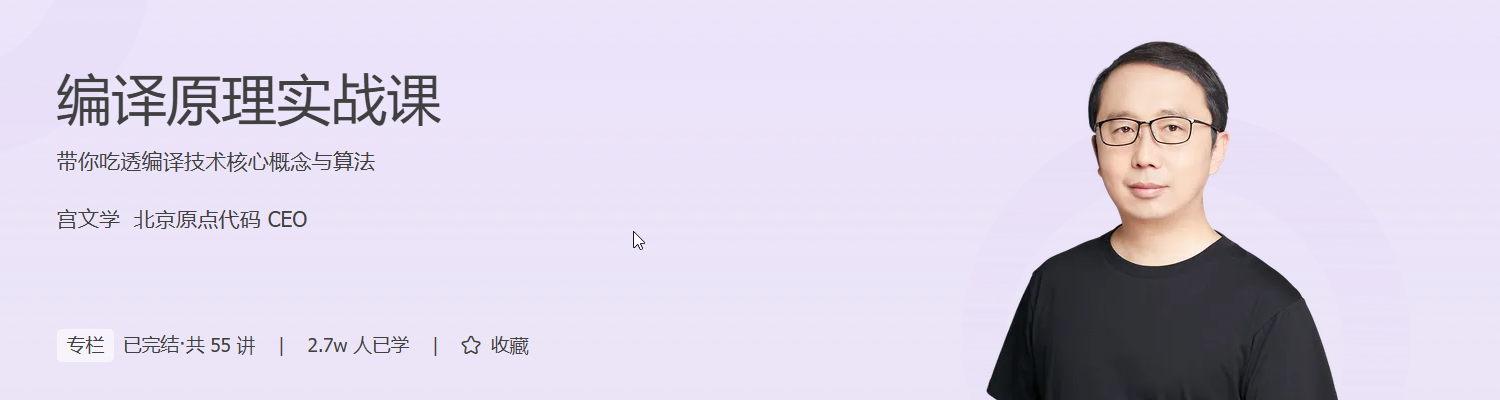 《编译原理之美》专栏课是从前端与后端两个层面来讲解编译原理的核心技术点,用具体的案例带你理解抽象的原理。宫老师说,这门课是带你在编译原理的世界里“读万卷书”,目的就是帮你一次性掌握编译原理最核心的概念、理论和算法。通过这门课,你能真正克服学习编译原理的畏难情绪,可以真正运用编译技术解决报表设计等实际问题。