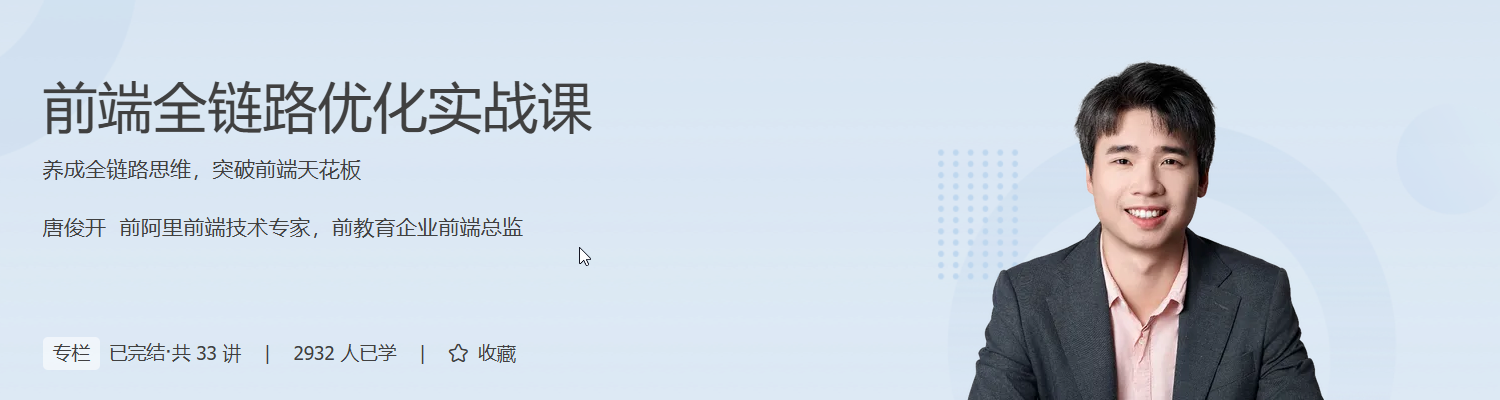 基于此,我们邀请到了唐俊开老师开设这门课程。他会结合 20 年来的前端开发经验,带你搭建一套属于自己的全链路问题解决方案,轻松应对用户问题和线上故障,突破能力天花板。