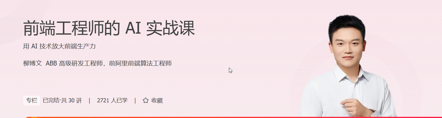 为此,我们邀请了长期深耕在 AI + 前端领域的柳博文老师,推出这门前端工程师的 AI 实战课,让你用最高效的方式建立对 AI 技术的清晰认识,给你带来技术和经验的双重收获。