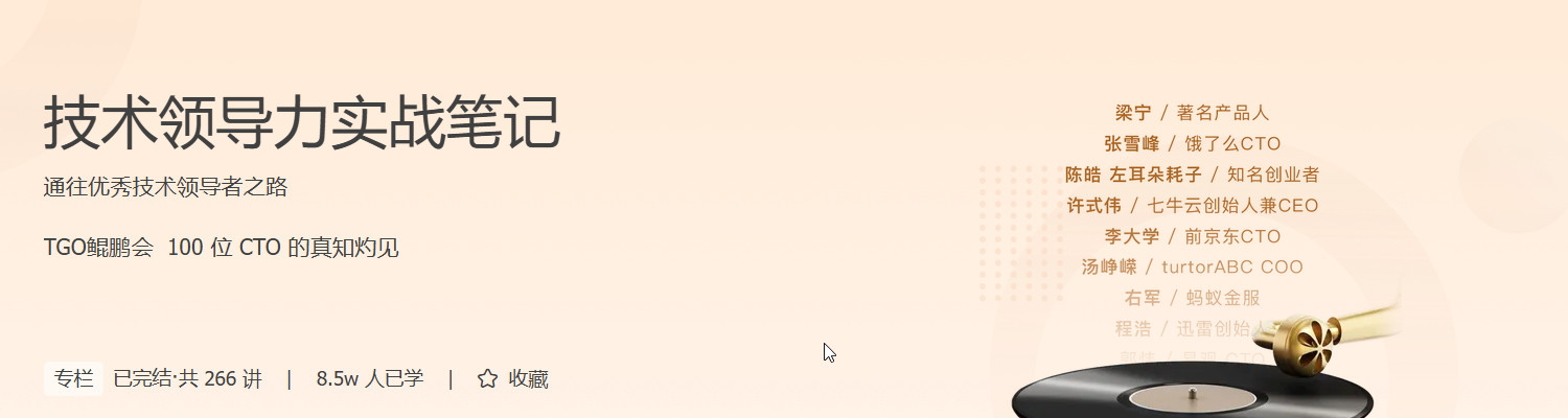 专栏将围绕技术领导力这一核心,分六大模块分享前沿技术和管理实战,帮助你理解卓越技术领导者的核心能力的概念和价值,更加明确自己的价值观和领导行为,清楚认识领导力提升的有效途径,掌握领导力提升的工具与方法,并制定自己的行动计划,踏上领导力提升的新旅程。