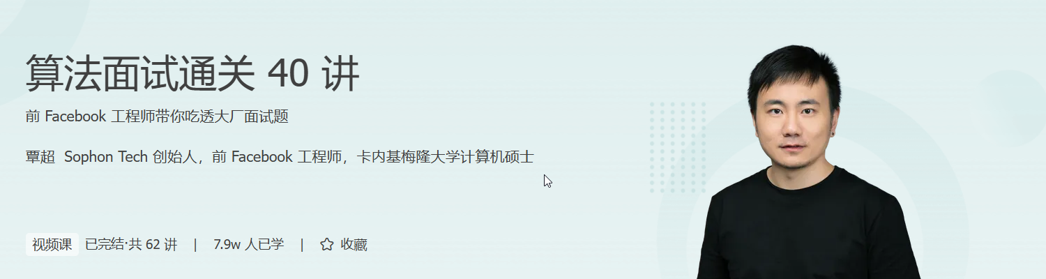 算法是人工智能的基石,掌握扎实的算法与数据结构能力,是通往顶尖科技公司、构建智能系统的核心通行证。本课程《算法面试通关 40 讲》由前 Facebook 工程师覃超倾力打造,专为有志于进入 BAT、Google、Facebook 等大厂的程序员和 AI 学习者量身定制。课程覆盖算法基础、高频面试题解析、LeetCode 解题策略,结合大量真实面试案例,带你系统梳理算法核心考点。
