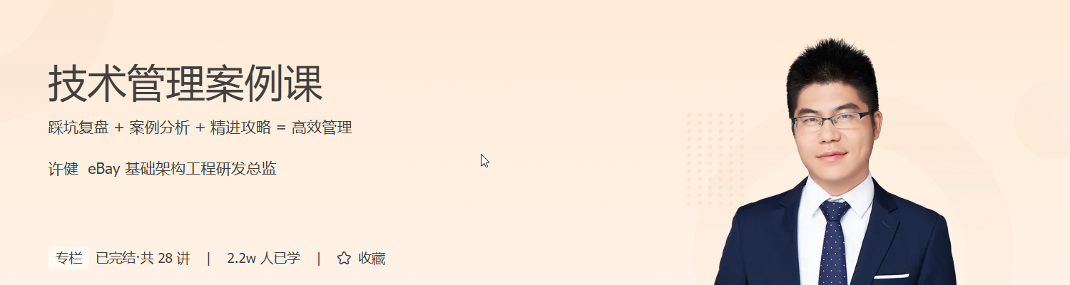 在技术快速迭代的时代,技术人才如何突破专业瓶颈,迈向更高层次的管理角色?《技术管理案例课》为你打开成长新维度,系统构建从一线工程师到技术决策者的进阶路径。课程由 eBay 研发总监许健主讲,结合多年实战经验,深入剖析领导力、团队协作、冲突解决、人才管理等关键能力,直面转型中的真实挑战。
