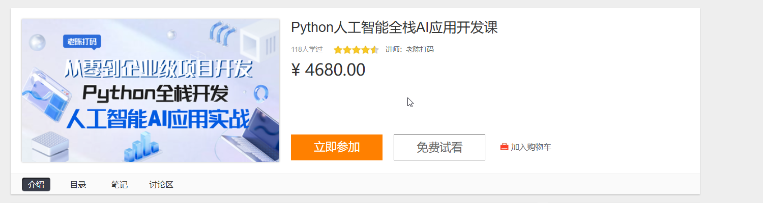 有课程学习问题和获取优惠券可以私聊老陈wx:13246806268。课程帮助大家零基础掌握AI编程开发课程,学完可掌握Python编程开发、WEB开发、AI提示词工程、数据爬取整理、AI机器学习和深度学习原理、AI绘画应用与开发、开源大语言模型应用与训练微调。以及各种开源AI应用,如换脸、语音合成、数字人等